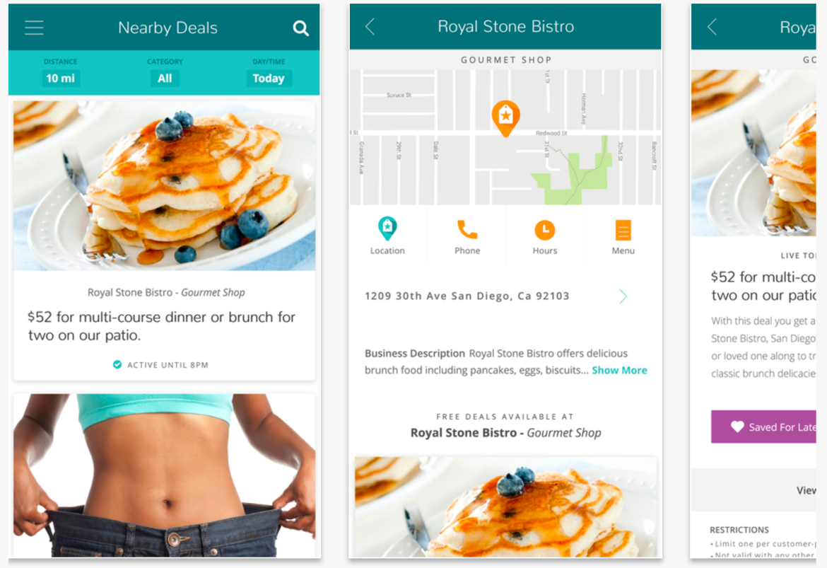 The resulting iPhone app makes use of iOS Core Location to keep track alert the user to deals near them. When the user finds a deal that they like, they can save the deal within the app. Later, as the time for that deal approaches, or if the user enters the area near that business, the user gets a notification on their phone reminding them of the deal. The user can utilize the deal with a tap and all the information about the claimed deals is recorded on the company’s web server.