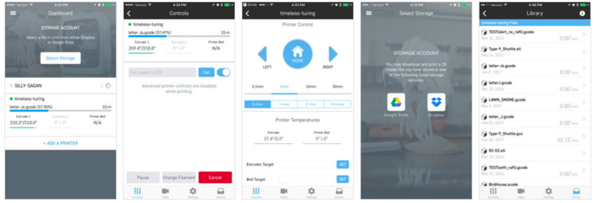 The app relies heavily on REST APIs to communicate with and control the various printers as well as to connect with 3rd party APIs including Dropbox, Google Drive, Thingiverse, and MyMiniFactory.